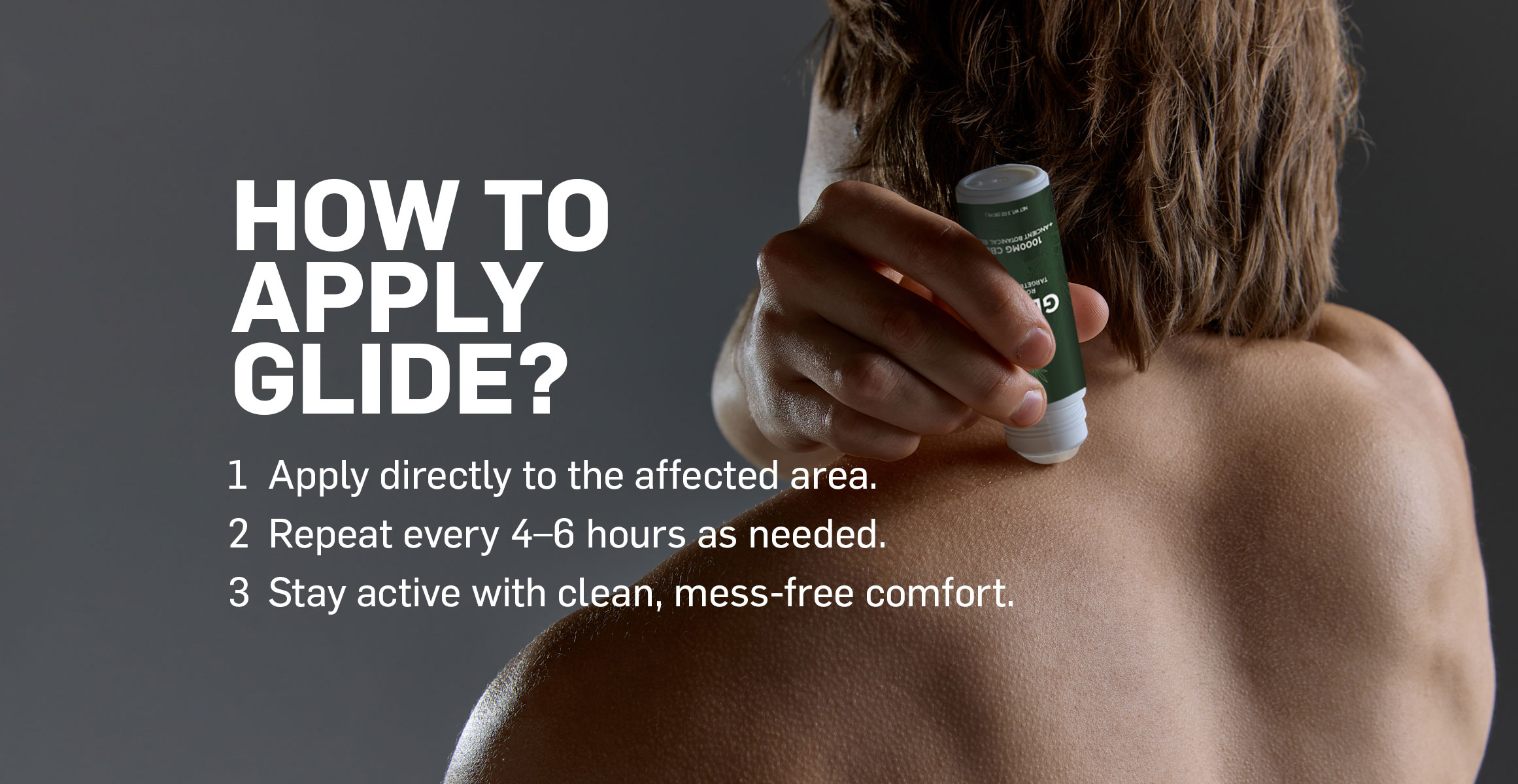 Part of our Comprehensive Body Therapy approach, GLIDE delivers fast, mess-free relief whenever you need it. Absorbing quickly with no handwashing required, it’s designed for instant comfort on the go—the ultimate grab-and-go solution for aches and pains.